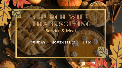 Join us in the Worship Center for our church-wide Thanksgiving service and meal. Meat and drinks are provided; please bring your favorite dish and dessert to share.